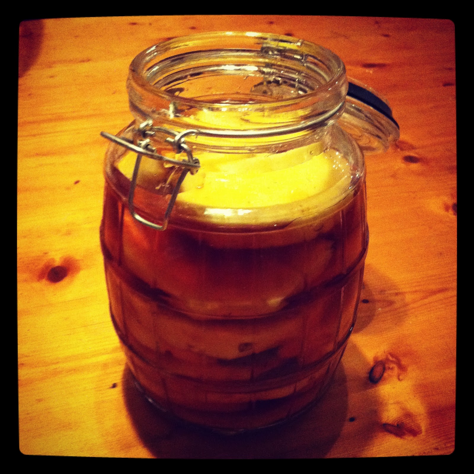 I am a massive cocktail fan but pretty rubbish at making them for myself so I’m not going to insult people who have actually mastered the art by trying to recreate a cocktail recipe. There was one thing that really caught my imagination though; all those flavour infused spirits at Mark’s Bar. This appears to me to be something I can really experiment with and I’m going to start by copying them with the tried and tested brandy and pineapple infused El Dorado rum. The only thing is, as this is an experiment, I’m definitely not going to ruin a good bottle of El Dorado rum. Sainsbury’s will just have to do...